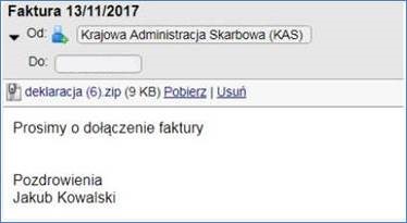 Ministerstwo Finansów i Krajowa Administracja Skarbowa (KAS) otrzymały informację o rozsyłanych na skrzynki pocztowe obywateli m.in. przedsiębiorców wiadomościach, które zawierają załącznik ze złośliwym kodem, udający deklarację. W polu nadawcy widnieje Krajowa Administracja Skarbowa, chociaż wiadomości faktycznie wysłane zostały z zagranicznych, prawdopodobnie przejętych kont pocztowych.