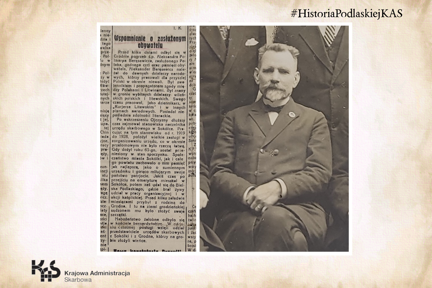 Pani Maria w odpowiedzi na nasz apel wystosowany w trakcie uruchamiania wystawy „Jak to dawniej bywało – z kart historii podlaskiej KAS" dostarczyła materiały dotyczące Aleksandra Beręsewicza za co serdecznie dziękujemy.