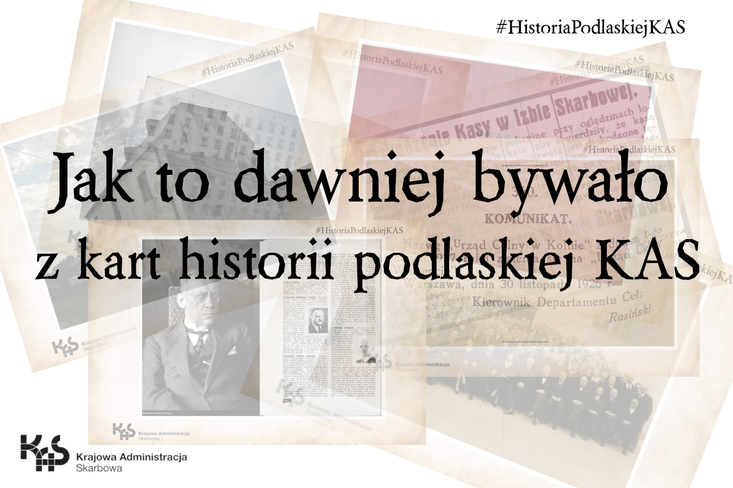Pamiętając o naszych poprzednikach, czyli zarówno o instytucjach które były przed nami, jak i o ludziach, którzy na przestrzeni ostatnich stu lat wykonywali zadania tożsame z naszymi, uruchamiamy nowy projekt – internetową wystawę historyczną, którą nazwaliśmy „Jak to dawniej bywało – z kart historii podlaskiej KAS".