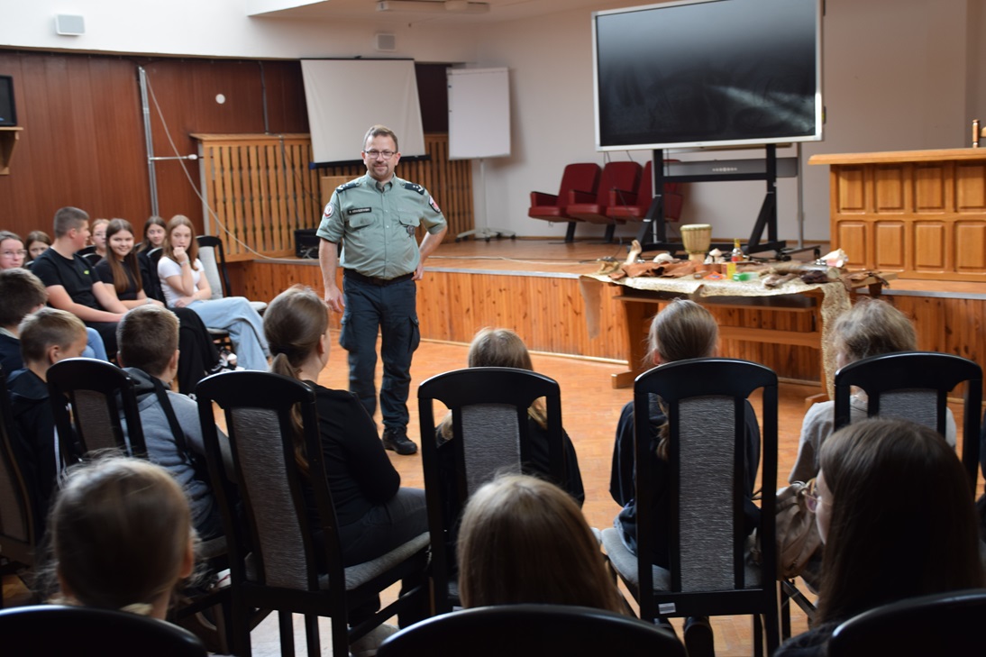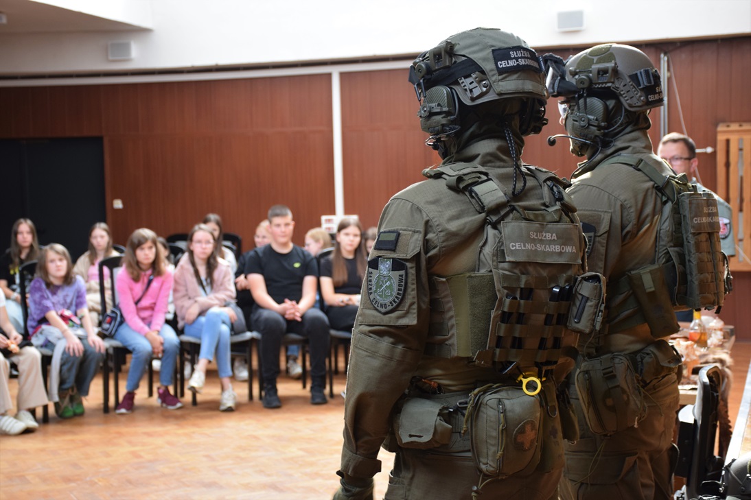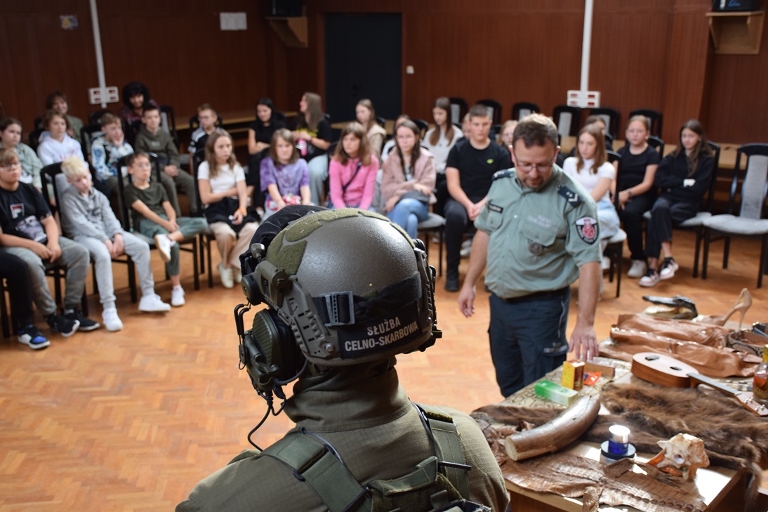 Funkcjonariusze rozpoczęli lekcję od przedstawienia czym jest Służba Celno-Skarbowa, kim są funkcjonariusze oraz jak wyglądają ich codzienne obowiązki. Opowiedzieli o roli, jaką pełnią w państwie. Szczególną uwagę poświęcili ochronie ginących gatunków zwierząt. Mundurowi zaprezentowali okazy CITES, czyli gatunki roślin i zwierząt zagrożonych wyginięciem, które zostały zatrzymane podczas prób przemytu przez granicę. Uczniowie dowiedzieli się jakie zagrożenia dla przyrody niesie nielegalny handel tymi okazami oraz na co zwracać uwagę podczas zakupów pamiątek w egotycznych krajach podczas wakacyjnych podróży.